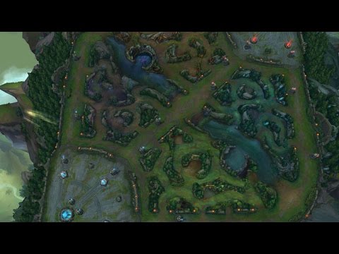 El mapa de arriba es La Grieta del Invocador la cual es un cuadrado con 3 calles principales 4 zonas de jungla, un río que cruza diagonalmente el mapa, 2 fosas con monstruos épicos y las dos bases para cada bando. Cada bando tiene 11 torres (atacan a los enemigos) 3 inhibidores (neutralizan los superminions) y 1 nexo. En las fosas aparecen dragones, heraldos y el barón nashor.